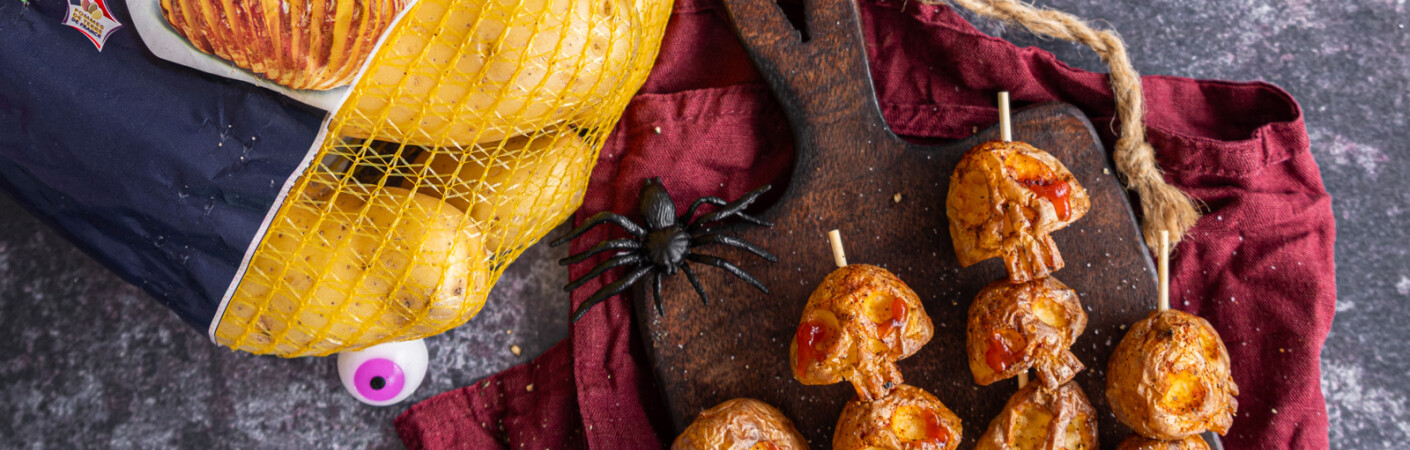 - Coupez chaque pomme de terre en deux. Sur chaque moitié, sculptez grossièrement une forme de tête de mort : incisez pour dessiner une bouche/dents, creusez deux trous pour les yeux.