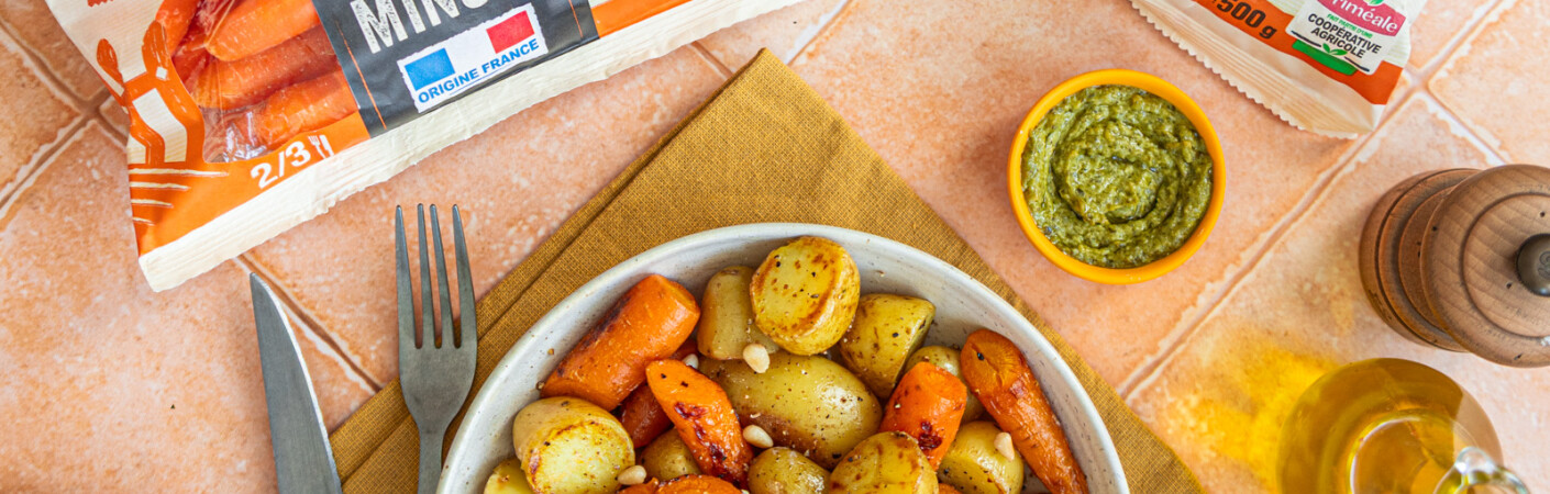 - Poêlée minutes de carottes et pommes de terre, burrata et pesto