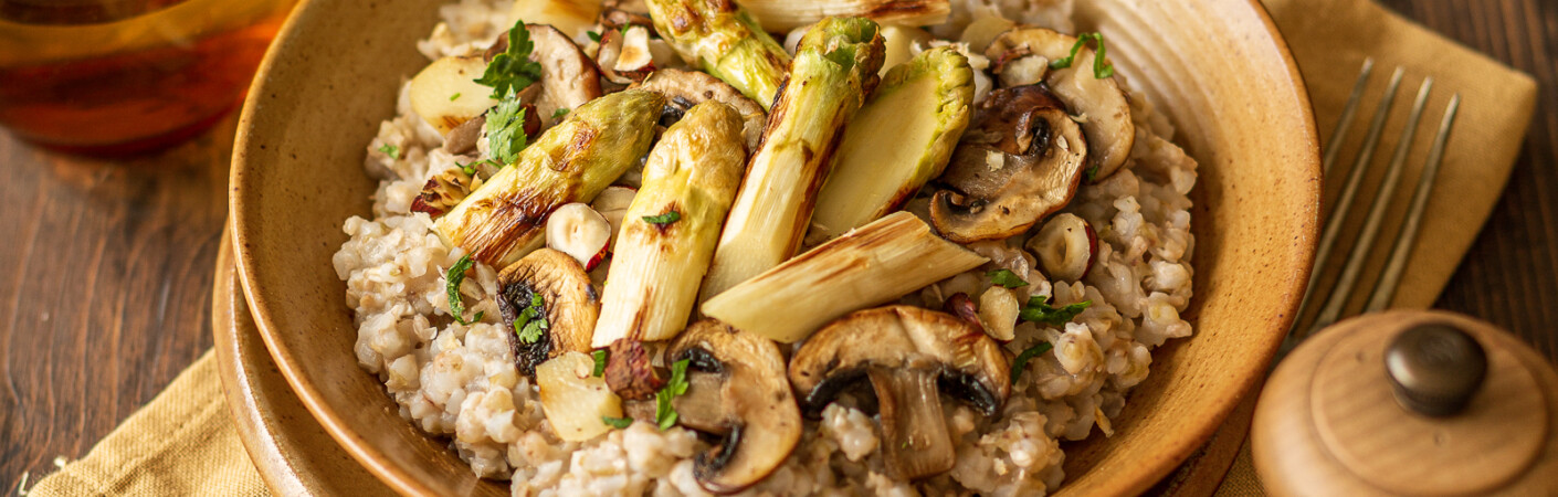 RISOTTO DE SARRASIN ET D’ASPERGES AUX CHAMPIGNONS