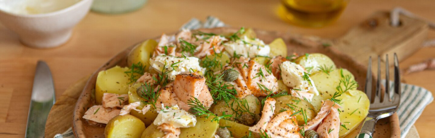 - Disposez-les dans une assiette creuse ou un plat. Ajoutez le saumon émietté ou coupé en morceaux, puis le fromage frais réparti par touches.